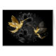 Colibríes con joyas negras y doradas sobre un fondo gris adornado con plantas. Aves de joyas. Ave dorada. Ave dorada.