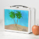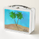 Caja de almuerzo con un escenario playero de palmeras tropicales, arena y cielo hechos a partir de un collage digital de acuarelas e imágenes estampadas