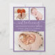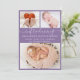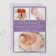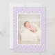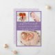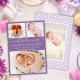 Nacimiento Púrpura de Niña Anuncio 3 Tarjetas de Collage de fotos. Elegante anuncio de nacimiento con 3 de tus fotos favoritas de bebé delante, con un texto con letras a mano de bonito "presentando" en un guión de caligrafía rápida con un tipo de letra de cruz con un fondo de color morado. Añada el nombre de su bebé al frente y las estadísticas de nacimiento. En la parte trasera hay una foto vertical de un bebé con puntos blancos de fondo lila suave. Puede personalizarlo fácilmente.