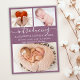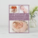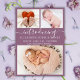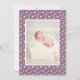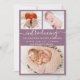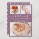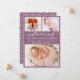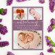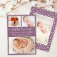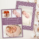 Nacimiento de bebé Mauve Anuncio 3 tarjetas de Collage de fotos. Elegante anuncio de nacimiento con 3 de tus fotos favoritas de bebé delante, con un texto con letras a mano de bonito "presentando" en un guión de caligrafía rápida con un tipo de letra de cruz con un fondo de color malva morado. Añada el nombre de su bebé al frente y las estadísticas de nacimiento. Al fondo hay una foto vertical de un bebé con puntos blancos que iluminan el fondo de la malva. Puede personalizarlo fácilmente.