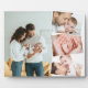 Crea tu propia placa fotográfica para bebés con 4 de tus fotos favoritas. La plantilla de la foto está preparada para crear un collage de fotos con una foto principal, ligeramente superpuesta con las otras tres fotos en un zigzag vertical. Las imágenes se muestran en formato vertical y horizontal con marcos blancos.