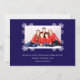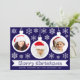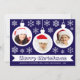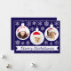 Una tarjeta de Navidad con foto para una familia con niños. Tiene 3 adornos blancos con fotos redondas dentro: una niña, un niño y un bebé, todos con gorros de Santa rojos. Los adornos están rodeados de copos de nieve blancos. El mensaje Feliz Navidad está escrito en un marco de cinta blanca, con los nombres debajo en mayúsculas. El fondo es azul oscuro.