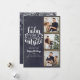 Un elegante diseño de vacaciones de collage de 3 fotos boho para que lo personalices con tus fotos favoritas en marcos dorados, mensaje, nombres y año en un fondo de pizarra. El reverso presenta copos de nieve que caen sobre un fondo de pizarra coincidente. Diseñado por Thisisnotme©