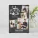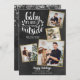 Un elegante diseño de vacaciones de collage de 4 fotos boho para que lo personalices con tus fotos favoritas enmarcadas en dorado, mensaje, nombres y año en un fondo de pizarra. La parte posterior presenta copos de nieve que caen en un fondo de pizarra coincidente. Diseñado por Thisisnotme©