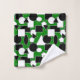 Este conjunto de toallas tiene un diseño Bauhaus de triángulos, círculos, rectángulos y pentagones en blanco y negro sobre un campo de verde.