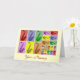 Un panel de saxofones coloridos en rojo, azul, verde, púrpura, amarillo y naranja dispuestos en un patrón de 3 x 2. Cada sax se establece en un panel de fondo rectangular con el color correspondiente. El diseño básico de 6 saxofones que componen la imagen principal se amplía aquí mediante la aplicación de la serie Fibonacci, en la que el patrón se repite como azulejos con cuadrados cuyos lados son números sucesivos de Fibonacci en longitud. En estos diseños esto da la impresión visual de que los saxofones se reducen sucesivamente en tamaño a la mitad, rotan 90 grados y se desplazan en mosaicos adyacentes, en secuencia. Fácil de personalizar y personalizar como tarjeta de cumpleaños feliz o felicitaciones