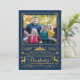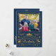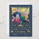Un collage de formas festivas y texto que dice "Una Navidad muy Feliz" en un falso efecto de Relieve metalizado de oro en un fondo azul marino. Las aberturas para una foto están incluidas en la parte delantera y en la trasera. Añade tu apellido y el año para personalizar esta fantástica tarjeta de vacaciones.
