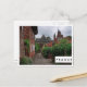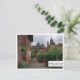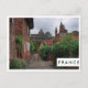 Postal de un sendero que conduce a Collonges-la-Rouge, el pueblo rojo, con sus casas rojas y su castillo de piedra roja con torres en Limousin, en la frontera de la región de Dordoña en Francia. La tarjeta tiene un marco blanco y el texto: 'Francia'.