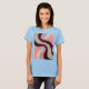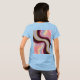 Esta es una imagen de arte digital con un patrón giratorio de color burdeos, rosa y amarillo pálido. El diseño crea un efecto espiral con un aspecto texturado a lo largo de los bordes. La paleta de colores cambia de color de burdeos en el centro a tonos rosa suave en los bordes exteriores, con acentos amarillo pálido. La textura tiene una calidad artística y granulada. El patrón es abstracto y fluido, con los colores mezclados y girando en movimiento circular. El fondo tiene una textura que añade profundidad e interés visual. La composición es una imagen digital con una calidad suave y etérea. La imagen está en la parte delantera y trasera de la camiseta. La camiseta es una camiseta básica para mujeres de color azul claro.