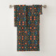 Colorful bath towel set featuring playful, abstract patterns with orange, blue, and yellow shapes on a dark background, creating a vibrant and modern style.
