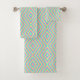 "Colorful geometric pattern towel set and washcloth with diamond shapes in pastel hues of pink, green, and blue creating a vibrant, lively design."