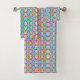 Colorful towels with vibrant, symmetrical patterns of red, blue, and yellow leaves displayed on a rack and flat surface, conveying a lively, decorative vibe.