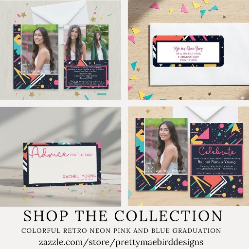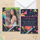 ¡Dé un paso al vibrante mundo de los 80 con nuestra invitación a la invitación de graduación inspirada en el retro! Con un fondo de azul marino profundo, brotes de formas abstractas de neón rosa, azul eléctrico y verde lima que recuerdan la estética icónica de la época. Frente y en el centro, una preciada foto captura la esencia de tu logro, irradiando orgullo y logro. Pasa la invitación para descubrir dos instantáneas más, mostrando el viaje que llevó a esta memorable ocasión. En medio de los vivos matices, nuestro mensaje de invitación sugiere: