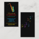 Tarjeta de personalizado moderna, hecha en negro, con gráficos de un saxofón colorido y caprichoso, en la parte superior de la tarjeta. El texto es totalmente personalizable de leer lo que quieras. Una tarjeta impresionante y memorable perfecta para cualquier tienda de música o profesor de instrumentos de latón.