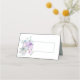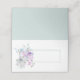 Tarjeta de boda plegada hecha en blanco y verde azulada de luz con un bonito ilustracion de un ramo de flores morado y verde azulado. El frente está listo para personalizar a mano para cada invitado en su boda.