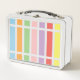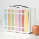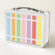 Patrón geométrico lineal, rectangular, rayado de tonos pastel arcoiris de azul, naranja, verde, rosa, púrpura, rojo y amarillo.