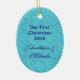 Elegante adorno de Navidad recién casado hecho en un fondo turquesa de bonito. Un colorido ilustracion vintage de un pavo real descansa sobre una flor blanca Fleur. El texto púrpura, en la parte delantera tiene el año, y en la parte trasera se lee, Nuestra Primera Navidad, luego los nombres de la pareja. Personalice el texto para leer lo que desee. El adorno de bonito que se puede utilizar durante todo el año como una lámpara y un ventilador o como decoración de pared, y hace una encantadora idea de regalo a las recién casadas.