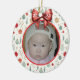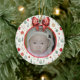 Colorido adorno navideño con una plantilla para tu foto favorita. El borde de fondo es un patrón de adornos de Navidad retro, ramos de pino y estrellas. Un arco rojo está en la parte superior donde se pone el año con la plantilla proporcionada. El lado inverso tiene el mismo patrón de adornos y un cartel para poner el nombre de su hijo. Esto sería un gran placer para los abuelos, padrinos, niñeras y más.