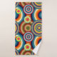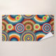 Este conjunto de toallas incluye un lavabo rosa, una toalla de mano morada y una toalla de baño con un diseño Bauhaus de diferentes grupos de círculos concéntricos con colores de los años 70.