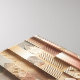 Una impresionante pieza digital arquitectónica que presenta una serie de columnas verticales adornadas con diversos patrones geométricos. El diseño muestra una mezcla rítmica de zigzags, círculos, líneas y motivos inspirados en lo tribal en una cálida paleta de terracota, arena y gris pizarra. Este arte en relieve 3D de alta textura es perfecto para agregar profundidad y un ambiente étnico moderno y sofisticado a interiores contemporáneos.