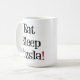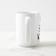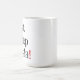 Taza blanca con el texto negro y un signo de exclamación rojo