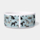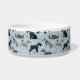 Perros Schnauzer en negro, sal y pimienta, y abrigos negros y plateados sentados, de pie y volando con huesos de perro dispersos y huellas de pata en un fondo azul claro.