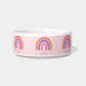 Cute boho tazón mascota arcoiris para mascotas. Naranja pastel colorido, morado y arcoiris rosa con el nombre de personalizable en color morado. Las estrellas y los corazones se dibujan dentro del arco iris.