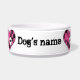 Adorable patrón de tablero de ajedrez rosa y negro retro de los años 80 con cráneos y corazones rotos rodeando un tazón de perro con espacio para el nombre de tu mascota.