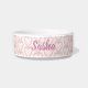 Muestra tu amor por tu preciado familiar de cuatro patas con este tazón de bonito que presenta un patrón de corazones punteados rosados pálidos. Añada fácilmente el nombre de su mascota en el cuadro que se proporciona.