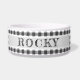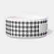 Este tazón para perros presenta un diseño de cuadro de búfalo negro y blanco rústico, también conocido como cuadro de leñador. En el centro hay un cuadrado gris bordeado en blanco donde puedes personalizarlo con el nombre de tu mascota.