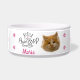 This bowl features pink paw prints with a princess crown, custom cat photo and name.