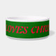 Este impresionante tazón de perro tiene un personalizado gracioso de un pavo Navidad con grandes ojos negros, un pequeño pico amarillo y plumas de cola pegadas. Los pies se encuentran en direcciones opuestas, lo que hace que el pavo parezca torpe. El pavo está usando un sombrero de Papá Noel rojo y blanco y está listo para los Navidades. El texto rojo festivo es el personalizable que le permite personalizar este tazón de perro con el nombre de su perro.