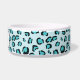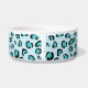 Este tazón azul mascota tiene un patrón de impresión de leopardo creado digitalmente con un arco de perro que tiene un área de texto de personalizable dentro de él para el nombre del mascota.