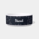 Pet bowl with a personalized dog name monogram in a cute script font paired with a pattern featuring digitally hand-drawn dog constellations and ditsy stars as a background. Check out our store for more matching items from this collection.