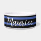 Una cocina elegante o un bol de agua para su perro, con un bonito diseño de rayas azules y negras. Personalice el nombre de su mascota en la tipografía de guiones, para un elegante toque de acabado individual.