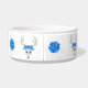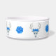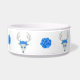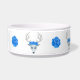 Este tazón de comida mascota está rodeado de cabezas de ciervos blancos fantasmales con grandes cuernos blancos, ojos azules y rosas en la cabeza. Bonitos grandes rosas azules están entre los ciervos.