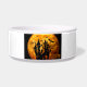 Este diseño presenta un feliz saludo de Halloween con una imagen de luna llena iluminada en un espeluznante tono de naranja brillante. También se puede ver una casa embrujada y murciélagos volando en el aire. Junto al texto hay dos pequeñas imágenes: una de un gato y otra de una calabaza, ambas asociadas con Halloween.