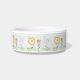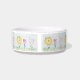 Cuesta mascota para comida o agua con flores primitivas brillantes y alegres contra un cielo azul en acrílico. Un lavado sencillo y sencillo, delineado en negro con un pincel de puntero.