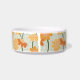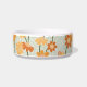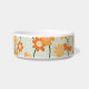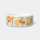 Patrón de repetición de bonito de flores naranjas y amarillas tipo conefluente o margarita sobre un fondo con estampado de mosaico. La combinación de colores apagados recuerda a los años 70.
