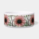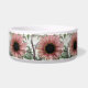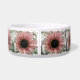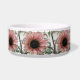 Este impresionante tazón mascota presenta una hermosa fotografía de un girasol rosa pálido. El girasol es de color rosa natural y los pétalos tienen un anillo exterior rosa pálido y un anillo interior rosado más oscuro. El medio donde están las semillas es negro. Esta fotografía fue tomada en un jardín.