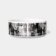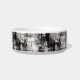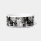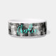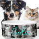 tazón mascota con fondo gris y negro y tu nombre en azul acuático.