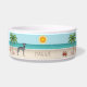 El original ilustracion personalizado de Destei de un lindo perro de raza azul Greyhound italiano / Iggy parado en una playa tropical de verano. En la arena de color beige hay una palmera, una concha rosa, una estrella de mar y un cangrejo rojo. El agua es azul turquesa con algunas olas y el sol brilla por encima del horizonte. También hay un área de texto personalizable para un nombre.