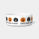 This spooky cute fall seasonal Halloween pet dog bowl features a pattern of orange and black jack-o'-lantern pumpkins all in a row with custom "No tricks, just treats! Happy Howl-o-ween!" modern black quote text that can be personalized.