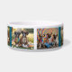 A dog bowl featuring seven breeds of dog dressed like hippies. From left to right, they are pug, poodle, French Bulldog, Dalmatian, Rottweiler, Basset Hound, and boxer.