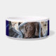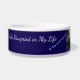 Este diseño de tazón de cerámica para mascotas coloca la foto de tu compañero en el centro, con su nombre y apodo elegantemente mostrados a la derecha. A la izquierda, la frase “Huellas de Dios en mi vida” se combina con una serie de huellas de patas azul claro, equilibrando la composición con simbolismo conmovedor. Un tributo moderno pero tierno, ideal para padres de mascotas que aprecian tanto la fe como la alegría de su amigo peludo.