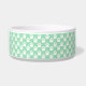 Este tazón para mascotas presenta un patrón de huellas de patas de perro blancas sobre un fondo de color verde menta. También hay un banner marrón con un área de texto personalizable para el nombre de tu mascota. El color beige se puede cambiar a cualquier otro color bajo personalización.