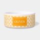 Este tazón para mascotas tiene un patrón de huellas de patas de perro blancas sobre un fondo de color naranja claro. También hay una banda naranja con un área de texto personalizable para el nombre de la mascota.