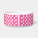 Este tazón para mascotas tiene una huella de perro blanca dentro de un círculo negro en el medio. Alrededor de él hay dos áreas de texto personalizables que ahora dicen "cena" y el nombre de la mascota. El fondo tiene un patrón de huellas de perro blancas sobre un color rosa. El color rosa se puede cambiar a cualquier otro color bajo personalización.