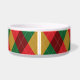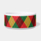 Patrón argyle festivo y colorido en esquema de colores rojo, verde y amarillo. También hay una forma de hueso de perro rojo que tiene un área de texto personalizable para el nombre de la mascota encima.