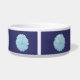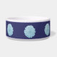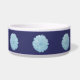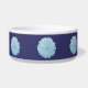 Este impresionante tazón mascota muestra una fotografía de una flor de marigold que ha sido manipulada para convertirla en un color azul pálido y helado. La flor se sienta sobre un fondo azul oscuro.